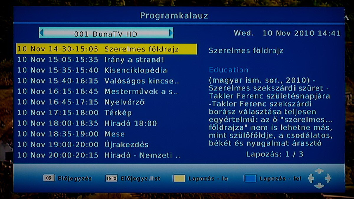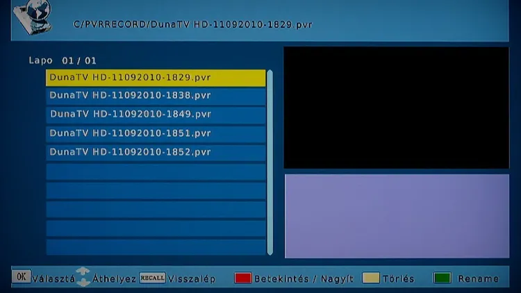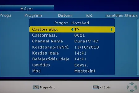 A box a menüben való kutakodáskor lassúcskának tűnt, de a bekapcsolási idő és a csatornaváltás ideje szerencsére elég rövid, így a mindennapi használat során a sebességgel nem lesz gondunk. Tévézés közben az éppen nézett műsor illetve a következő film címét (illetve a kezdési időket) bármikor megnézhetjük, ha megnyomjuk az Info gombot, a részletes tartalomért pedig az EPG-t hívhatjuk segítségnek. Az EPG hasznos akkor is, ha elmékeztetőt vagy felvételi időzítőt szeretnénk beállítani; előbbi az OK, utóbbi a Rec gombbal, egyetlen gombnyomással programozható. Emellett azért van lehetőség manuális programozása is, ami főleg akkor jöhet jól, ha ismétlődő felvételeket szeretnénk készíteni. Természetesen a felvételi lehetőség csak akkor és, ha az USB-re csatlakoztattunk egy HDD-t vagy egy USB sticket! A felvételkészítés a tunert teljesen lefoglalja, így közben nem lehet korábban rögzített műsort sem nézni.