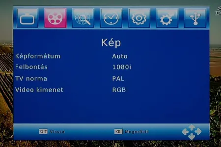 A második menü a képbeállításokat tartalmazza, itt a módosíthatjuk a képarányt (auto, 4:3, 4:3 Pan and Scan, 4:3 letterbox és 16:9 választhatók), a felbontást (1080i, 720p, 576p, 576i) a TV szabványt (PAL, NTSC) illetve a színteret (RGB, CVBS).