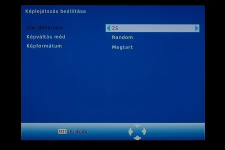 A hetedik, utolsó menüben van a médialejátszó, illetve itt lehet a képek kezeléséhez és a filmlejátszáshoz kapcsolódó minimális beállításokat is megadni (diavetítés lépésköze, feliratok mérete, színe, képarány).