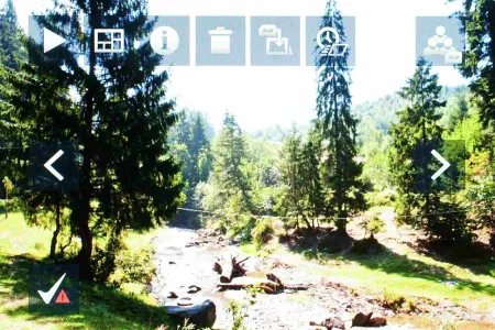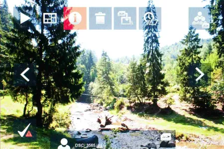 A képernyőt megérintve kerül elénk a vezérlőpult, amelyről az alapfunkciókat elérhetjük, illetve a nyilak segítségével manuálisan is léptethetjük a fotókat. Ez utóbbi egyébként gesztusokkal is lehetséges, egyszerűen csak jobbra vagy balra végig kell simítanunk a kijelzőt a léptetéshez.