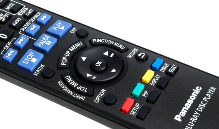 A távirányító funkcionálisan (a korábban említett menüs gondokat leszámítva) nem rossz, és pozitívum, hogy korlátozásokkal ugyan, de tévé és erősítő vezérlésére is alkalmas. (Tévénél használható funkciók: bekacsolás, csatornaváltás, bemenetváltás és hangerő, erősítőnél: hangerő.) Filmlejátszás közben az alapfunkciókat a középen elhelyezkedő kék gombokkal érjük el, a lemez menüihez pedig a kurzormozgató gomb körüli három gombbal férünk hozzá.