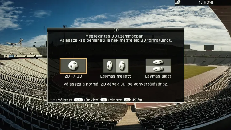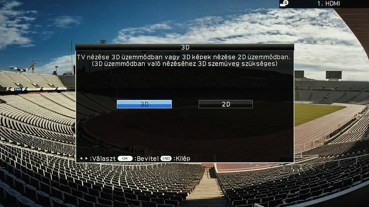 Ha a tévé 3D jelforrást észlel, automatikusan 3D-be vált (ezt a funkciót kikapcsolhatjuk, ha szeretnénk). A 3D beállításaihoz a távirányítón lévő külön gombbal férhetünk hozzá; az előugró menüben lehet állítani a 3D módot (kivéve automatikus felismerés esetén), a 2D-3D átalakítást és a fényerő-kompenzációt is. Ez utóbbi háromféle fokozatban (alacsony, közepes és magas) azt adja meg, hogy az elektronika mennyivel emelje meg a fényerőt 3D üzemmódban azért, hogy kompenzálja a szemüveg lencséjének sötétítő hatását. A magas beállítást használva egyébként a panel van annyira fényes, hogy akár még nappali fényviszonyok között is élvezhető legyen a 3D, viszont a tükröződő előlap miatt mindenképpen jobban járunk, ha valamennyire besötétítjük a szobát.