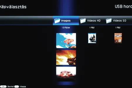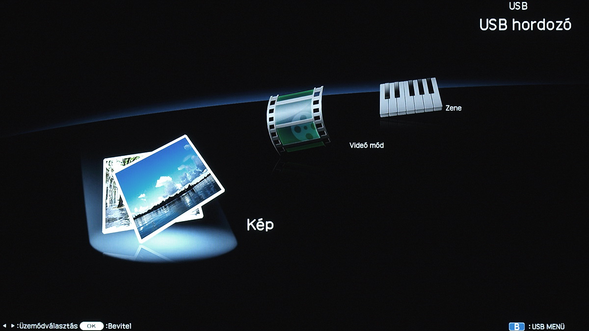 De kezdjük a médialejátszóval, amely a Sharpnál szintén első generációs. Az LE8-as és LE9-es sorozatban ugyanaz a szoftver dolgozik. Az USB csatlakozóra kötött meghajtót a bemenetválasztó segítségével választhatjuk ki, külön médialejátszó gombot nem ad a Sharp a távirányítón. Ezt részben pótolja, hogy az USB stick csatlakoztatásakor automatikusan elindul a médialejátszó GUI-ja. A főképernyő a három főkategória, a videók, zenék és képek elérésére szolgáló ikonokat tartalmazza.