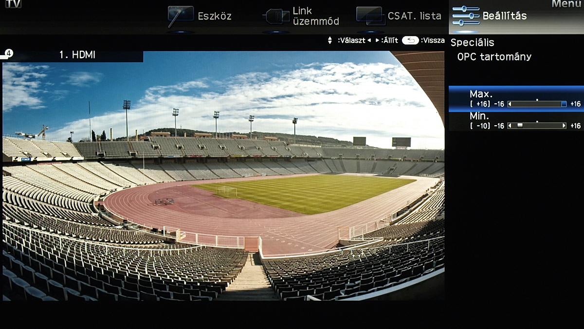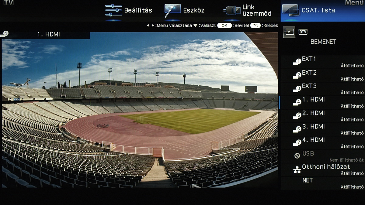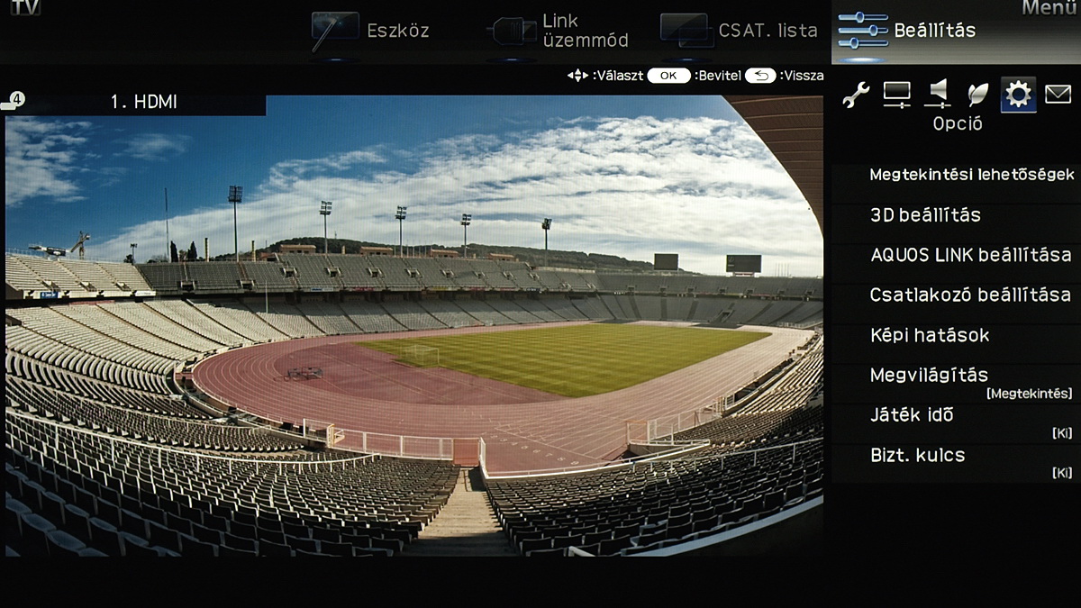 A menü csak a kijelző felső és jobb oldali részét foglalja el, ha bármit állítani szeretnénk akkor a fennmaradó, elég nagy méretű helyen a tévé képét látjuk „kicsiben”. Ez azért jó, mert így majdnem mindig azonnal látható, hogy egy adott paraméter megváltoztatása milyen eredménnyel jár. Azért csak majdnem, mert a menü szigorúan 2D-s, így a 3D-vel kapcsolatos beállítások előnézeti képéről le kell mondanunk. Az elrendezés kicsit szokatlan más tévék menüjéhez képest, de gyorsan meg lehet szokni.