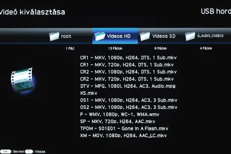 A médialejátszó tudása sajnos csak közepes, s nagyjából a már unalomig ismételt megszorításokkal találkozunk. Ezek közül a legfontosabb az, hogy a H.264 kódolású MKV-kat a rendszer csak L4.1-es szintig kezeli, a DTS hangot pedig egyáltalán nem tudja kezelni. A formátumtámogatás az MKV-k mellett az MPG, DAT, AVI, WMV és MOV konténerekre terjed ki, az M2TS fájlokat és a VOB-okat viszont nem látja a rendszer. A kodekek közül az MPEG-1/2/4, a H.264, a WMV támogatottak, míg a hang MP3, AC3, WMA illetve AAC lehet. A tévé a konténerek többségénél több hangsávot is támogatat, viszont feliratok kezelésére egyáltalán nem sikerült rávennünk.