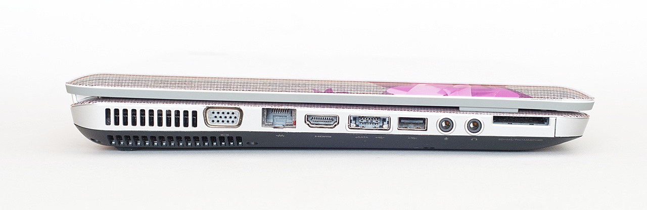 A csatlakozási lehetőségek területén a dv6 Rossignol kifejezetten jól teljesít. Az előlapon két hangszórónyílás látható, mellettük a feliratokkal, amelyek a gép különleges hangminőségét hivatottak jelezni (azért aki valóban igényes erre, az vásároljon külső hangfalakat vagy egy fejhallgatót). A gép bal oldalán, elölről hátrafelé haladva, elsőként a kártyaolvasó (SD, MS, MMC és xD kompatibilis) nyílását találjuk, majd a hangcsatlakozók és egy USB port következik. Ezután jön egy kombinált eSATA/USB csatlakozó, a HDMI kimenet, az Ethernet port és a D-Sub csatlakozó. Utolsóként a hűtőrendszer oldalra és lefelé is működő kimeneti nyílása következik.