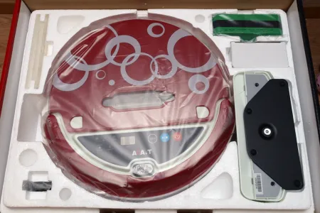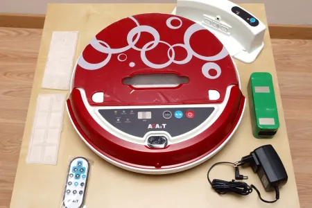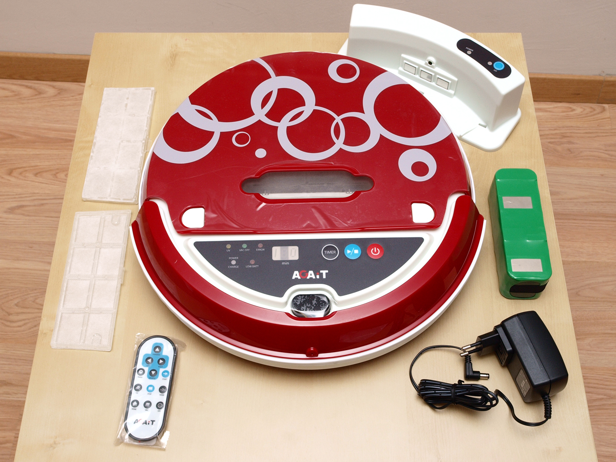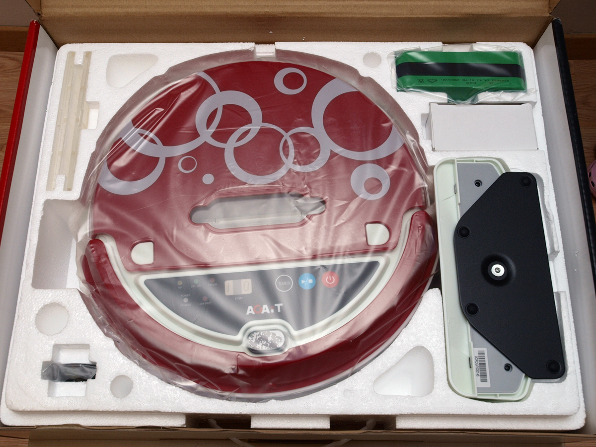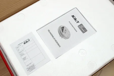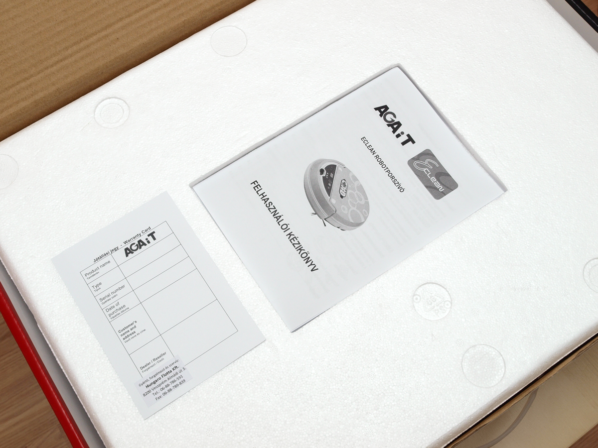 A doboz tetejének felnyitása után a magyar nyelvű használati útmutató és a garanciaszelvény fogad, a porszívót pedig a szokásos nikecel tábla védi. Kicsomagolás után azonnal látható, hogy az AGAiT ugyan hasonlít a Roombához, de annál azért jóval egyszerűbb, szerényebb szerkezet. A dobozban a robot mellett egy távirányítót, egy dokkolót, két szűrőt és a nélkülözhetetlen Ni-MH (14,4V 2500 mAh) akkumulátort találjuk. Nincs virtuális fal és nincs portörlő kendő (az a Roombában sincs, de a kínai és koreai modelleknél divat).