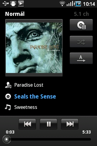 A zenelejátszó a szokásos funkciókat nyújtja, tehát különféle paraméterek alapján kereshetünk a fájlok között és rendelkezésre áll EQ is. A számok lejátszása közben az ID3 mezőkben található információk és az albumképek természetesen megjelennek, tudunk lejátszási listát is készíteni, amelynek sorrendjét később még módosíthatjuk is. Amennyiben a lejátszási ablakban rákattintunk az adott dal címére, előadójára vagy albumára, egy menüt kapunk, amin keresztül releváns információkra kereshetünk a neten, a YouTube-on, vagy a készüléken található többi dal között.