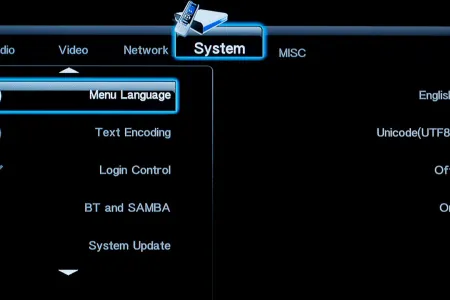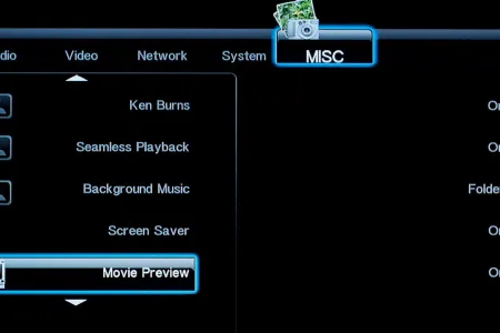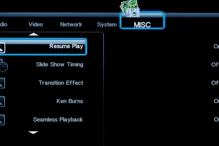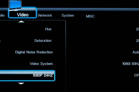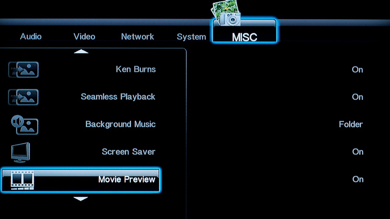 Tévéhez vagy projektorhoz csatlakoztatva a lejátszót a megszokott felbontások és frissítések állnak rendelkezésre, közöttük 1080p/24 Hz is. Különleges opciókat nem találunk a menüben, de lehet változtatni a fényerőn, a kontraszton és az árnyalaton, illetve a HDMI-be kevert hangjel típusán is. A rendszerbeállítások között lehetőségünk van ki- és bekapcsolni a tárolók hálózati megosztását, illetve a hozzáféréshez felhasználónevet és jelszót is rendelni.