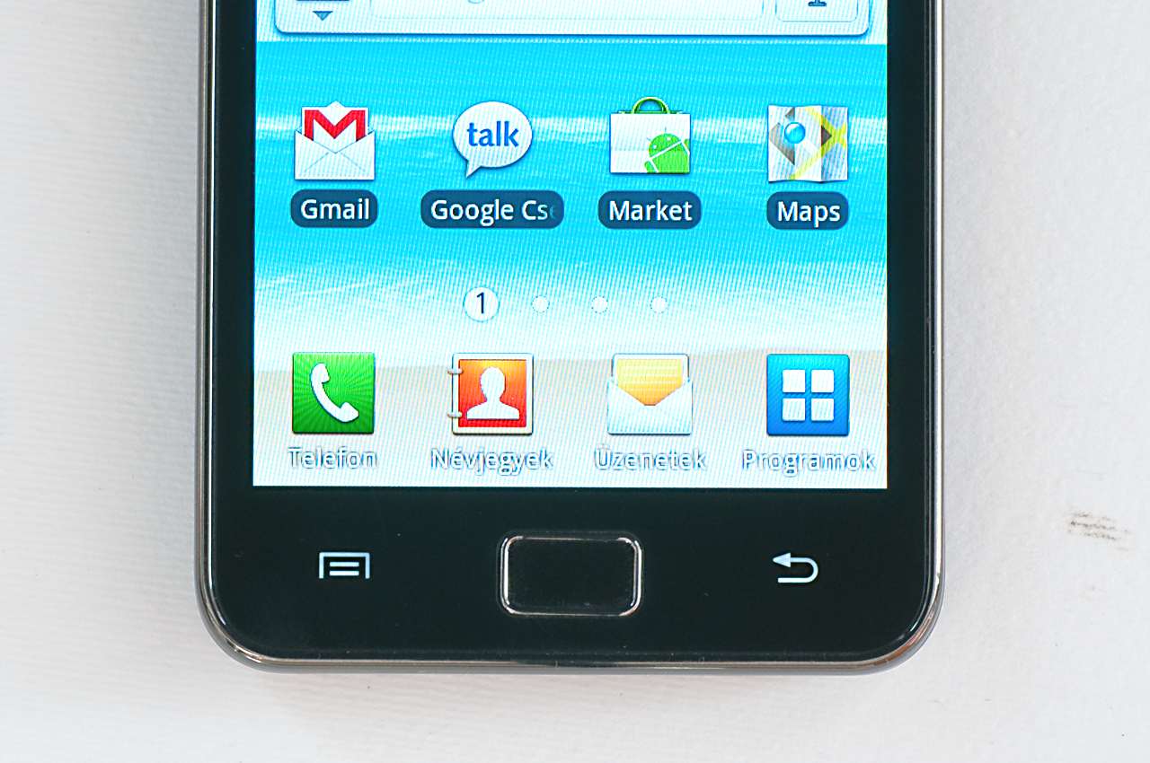 A többi érintőképernyős telefonhoz hasonlóan az előlap jó részén itt is a kijelzőt találjuk, ami alatt a Samsung a korábbi S-sel megegyezően három gombot helyezett el. A középső „valódi”, azaz fizikai gomb, a két szélső viszont érintésérzékeny, és ezek csak akkor válnak láthatóvá, ha háttérvilágításuk működik. Apró figyelmesség a Samsung részéről, hogy ennek a háttérvilágításnak a működését is beállíthatjuk, megadhatjuk például, hogy ugyanakkor világítson, amikor a kijelző, vagy csak akkor, ha sötét van. A gombok közül a bal szélső a menüt hívja elő, nyomva tartva pedig a keresőt indítja el. A középső egyszer megnyomva a Home gomb feladatát látja el, nyomva tartva a az utoljára elindított programok listáját, kétszer megnyomva pedig a hangutasítások menüjét indítja el. Végül a jobb oldali gomb a visszalépésre szolgál.