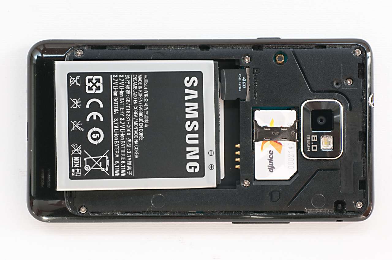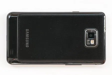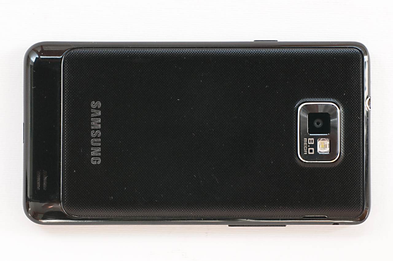A készülék hátsó oldalán alul egy fényesebb sáv látható, ez tulajdonképpen a Galaxy S-től örökölt kidudorodás, aminek jobb oldalán a hangszóró rácsát is láthatjuk. A rücskös, és teljesen ujjlenyomatálló elemfedél felső részén, középen a 8 MPixeles, viszonylag nagy látószögű kameramodul, és a hozzá tartozó LED-es segédfény látható. Ha eltávolítjuk a fedelet (vigyázat, törékeny!), akkor az 1650 mAh-ás akku mellett a SIM kártya és a microSD helyét találjuk meg – érdekes módon míg az előbbihez az akku eltávolítása nélkül is hozzáférünk, addig az utóbbi cseréjéhez már ki kell kapcsolnunk a készüléket).