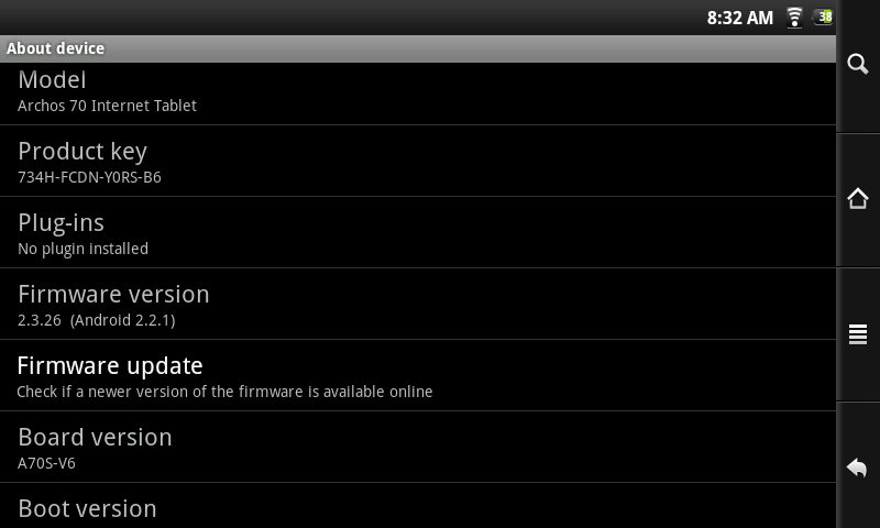 2010 szeptemberében, amikor bejelentésre került az Archos Gen8-as család, aminek a tagja a 70-es modell is, a Froyo volt a legújabb Android verzió, így a tablet is ezt kapta. Ekkortájt még a Google sem jelentette ki azt, hogy ez bizony nem ekkora kijelzőre lett kitalálva. Sajnos nemcsak Honeycomb rendszerre való frissítés nem lesz elérhető, hanem még a Gingerbread sem valószínű hogy letölthető lesz a készülékre.