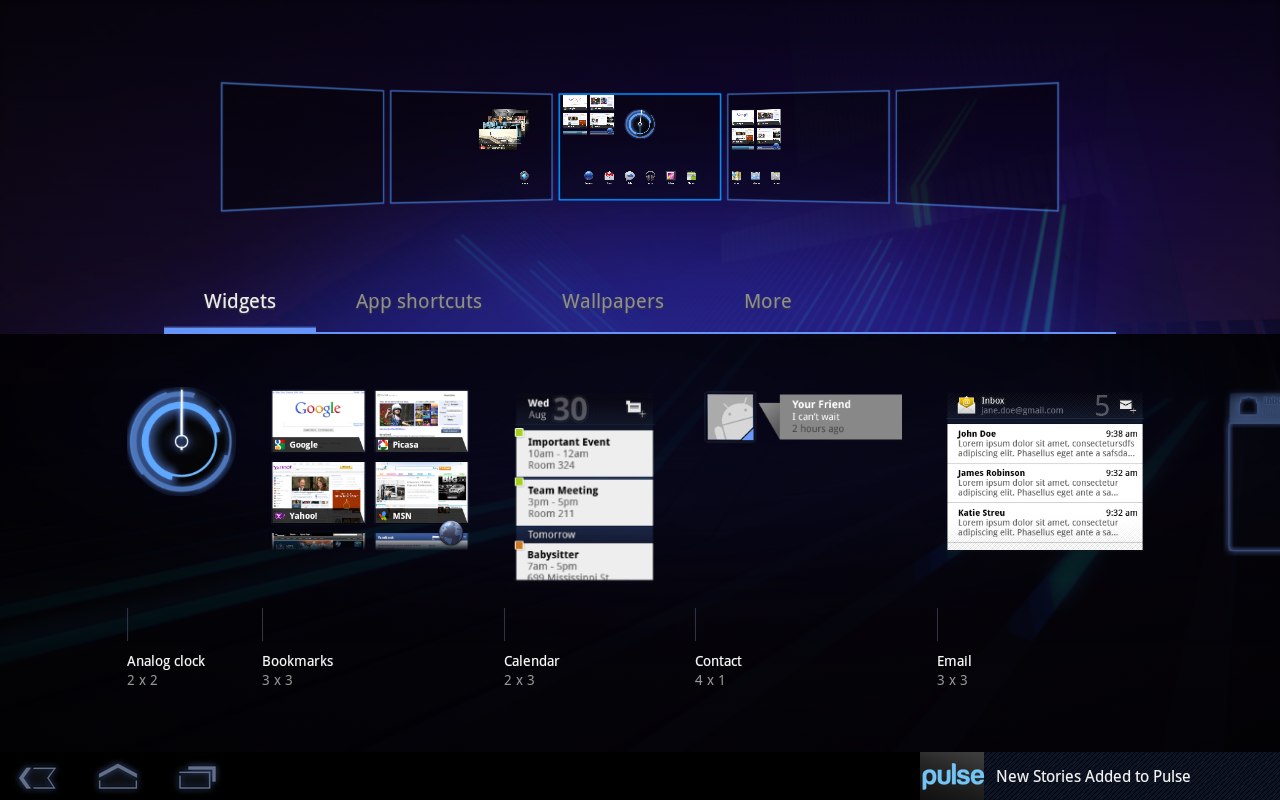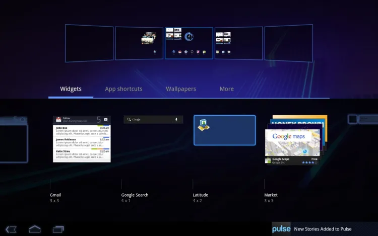 A widgetek száma egyelőre nem túl nagy, viszont szolgáltatásaik a képernyőméret miatt sokszor túlmutatnak a telefonos változatokon. Ilyen például a Bookmarks, amely kedvenc weboldalaink előnézeti képét mutatja, vagy a Market, amelyen a programok képernyői között lapozhatunk. A tökéletes testreszabhatóságot keresőknek rossz hír viszont, hogy a kezdőképernyők száma és sorrendje nem módosítható.
