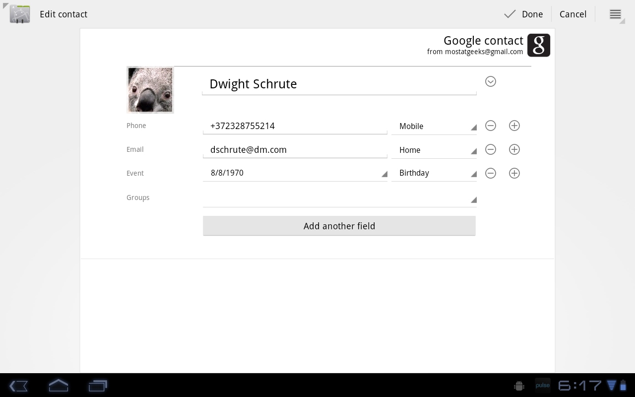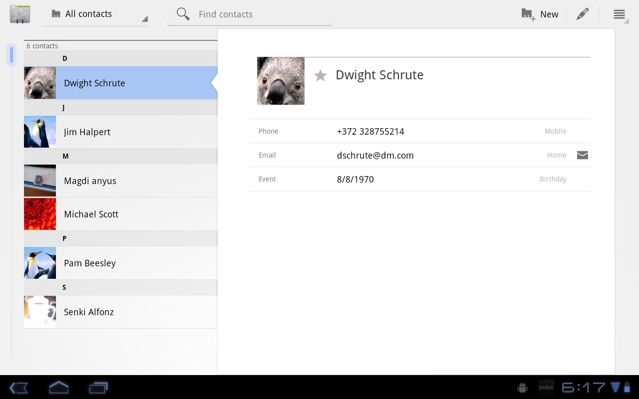 Ami a többi alapszolgáltatást illeti, ezek kinézetét úgy tervezték meg, hogy kihasználja a nagyobb kijelző adta lehetőségeket. A névjegyek például két oszlopban jelenik meg, a bal oldalon a listát, a jobb oldalon a kiválasztott kontakt részleteit láthatjuk. A felső sávban pár gyakran használt parancsot találunk, amelyekkel kereshetünk a bejegyzések között, szerkeszthetjük az aktuális névjegyet vagy létrehozhatunk újakat. A beállítások menüje (a többi Honeycomb-alkalmazáshoz hasonlóan) a jobb szélső ikonra kattintva bújik elő.