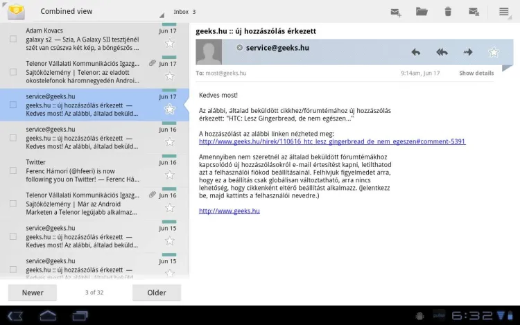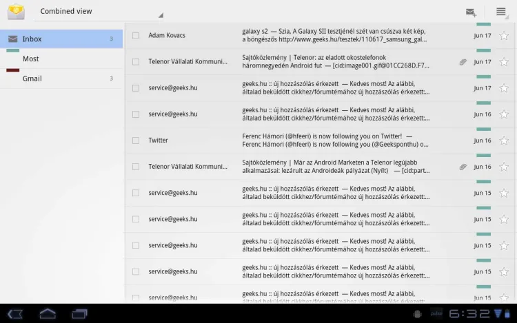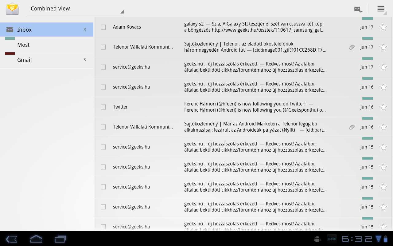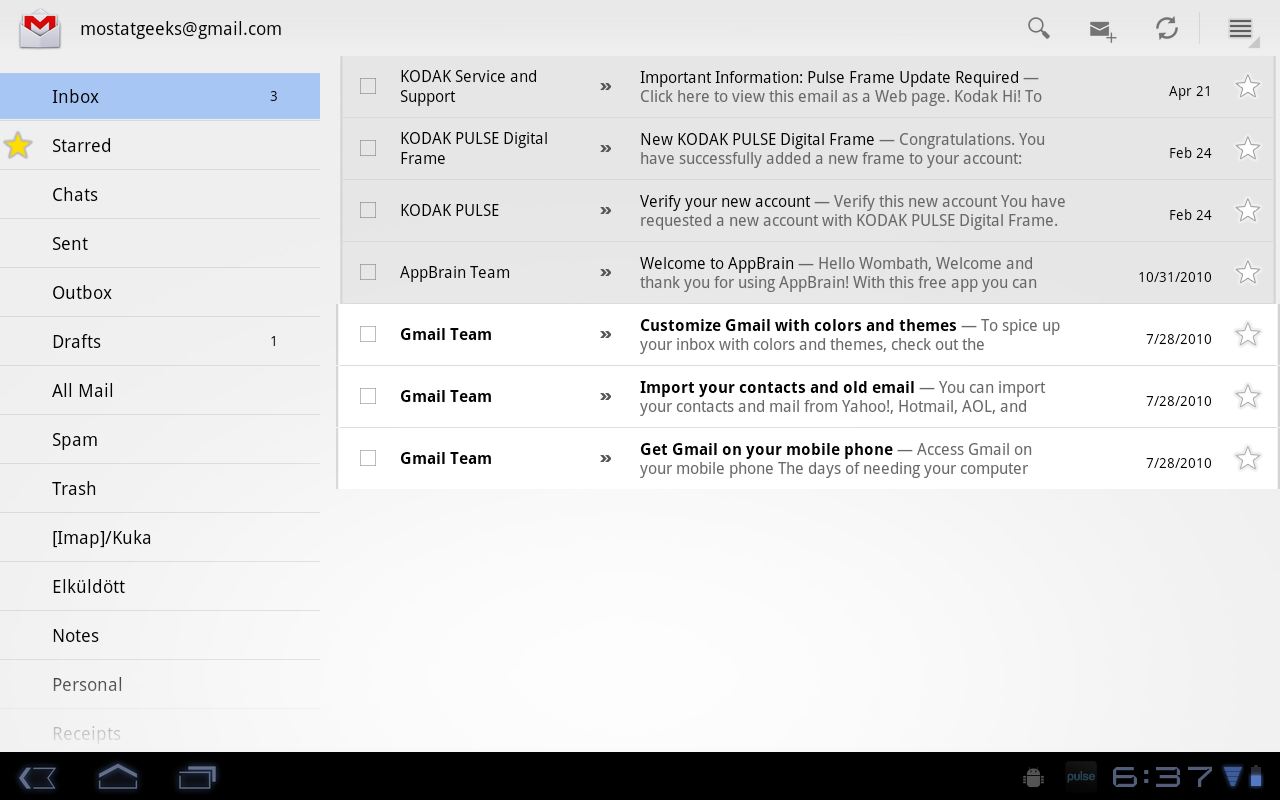 Levelezésre a telefonok mintájára két alkalmazást is kapunk, az egyik a Gmailhez, a másik az összes többi fiókhoz való (persze az utóbbi is képes csatlakozni a Gmailhez például IMAP-on keresztül). Ezek kinézetüket illetően szintén két hasábban jelenítik meg az információkat, tudásuk pedig megegyezik a telefonos változatéval: egyszerre kezelhetünk több fiókot, létrehozhatunk mappákat, kereshetünk a levelek között, és így tovább.