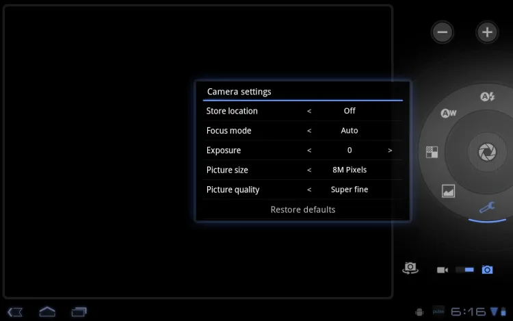 Utoljára hagytuk a fényképezőgépet, amelynek igazából egyetlen baja van: nagyon kényelmetlen használni. Ez egyszerűen annak köszönhető, hogy egy közel 600 grammos és 250×170 mm-es fényképezőgépet nem lehet rendesen kézben tartani. Ezen csak kis mértékben segít az, hogy a virtuális exponálógomb a kijelző jobb szélére, nagyjából hüvelykujjunkhoz került, és körülötte helyezték el a „beállító tárcsát” is. Az aktiválható funkciók olyanok, amit egy mobiltelefonban is elvárhatunk, a képminőség pedig a 8 Mpixeles szenzornak köszönhetően nem is rossz, az előlapi kamera pedig önarcképhez és videotelefonáláshoz pont megfelelő. Videókat a hátsó szenzorral Full HD felbontásban tudunk készíteni, szóval nem panaszkodhatunk a specifikációkra.