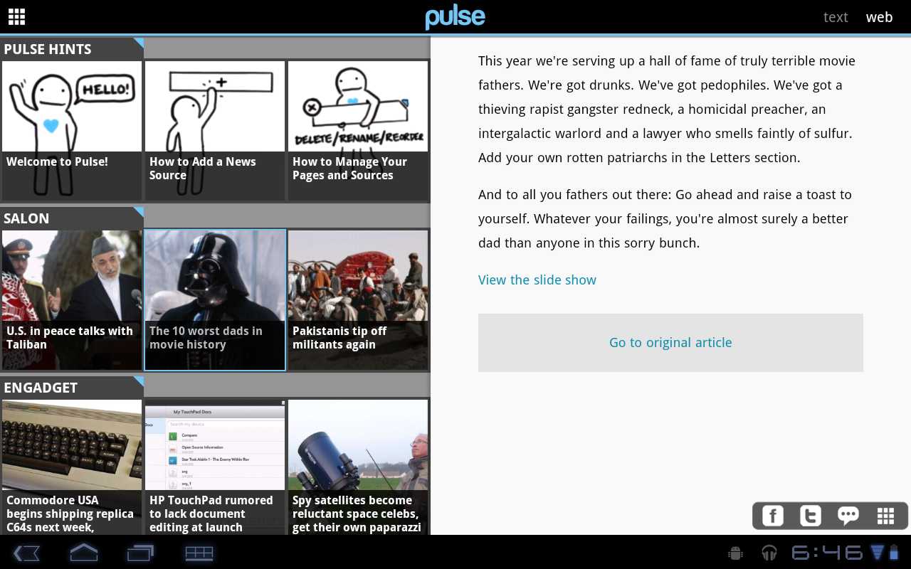 A Pulse nevű RSS olvasó a telefonokon is elérhető, csak le kell tölteni a Marketről. Maga az alkalmazás egyébként kiváló, és a táblagépekre optimalizált változat szépen kihasználja a nagyobb kijelző adta lehetőségeket a kéthasábos megjelenítéssel. Utoljára maradt a Service Info, ami a SIM kártyán található SMS-ek megjelenítésére való.