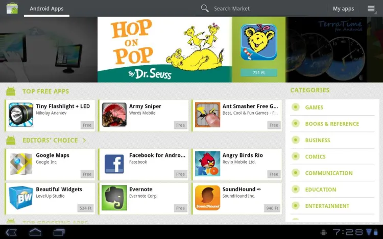 Ne feledkezzünk meg persze a tablet tudásának bővítésére való Android Marketről sem. Ezzel jelenleg egyetlen probléma akad: a táblagépekre optimalizált alkalmazások száma most még elég alacsony. Persze semmi akadálya sincs a „normál”, telefonos alkalmazások letöltésének, de ezek használata sokszor nem igazán kényelmes, és gyakran előfordul az is, hogy a nagyobb felbontás és képernyőméret miatt a Galaxy TAB 10.1v-n csúnyán néznek ki.
