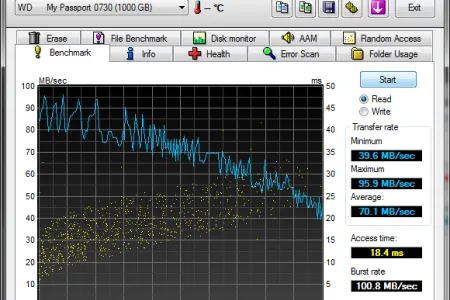 A WD, ahogyan korábban már említettük, saját merevlemezt épített a My Passportba. Teljesítményére nem lehet panaszunk, hiszen olvasásnál a lemez elején 100 MB/s feletti tempót, átlagosan pedig 70 MB/s-os sebességet mértünk, de a HDD írásnál is tudja tartani a 60 MB/s-ot, ami nagyon jó értéknek számít.