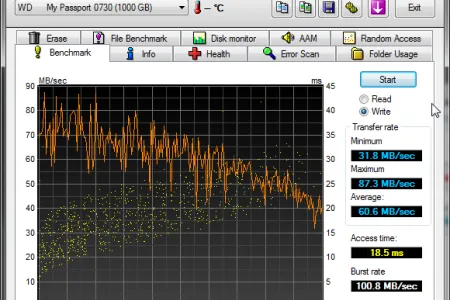 Az elérési idő 18,5 ms, ez nem túl kevés, de a kategóriában még mindig jónak mondható, így a WD meghajtója kevesebbet veszít tempójából akkor, ha nem nagyméretű fájlokkal, hanem sok kis állománnyal dolgozunk. USB 2.0 interfészre csatlakoztatva a HDD-t, sebessége a várakozásainknak megfelelően, 31 MB/s körül alakult, olvasás és írás esetén egyaránt.