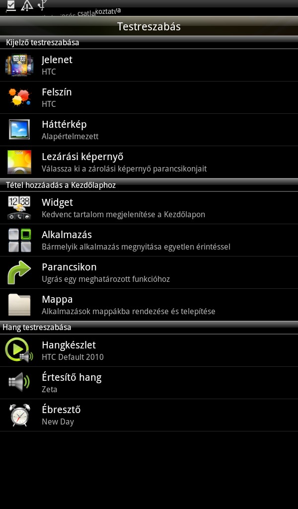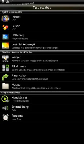 A képernyők testreszabása a többi androidos készülékkel megegyező módon történik, azaz könyvtárakat, minialkalmazásokat és shortcutokat is kipakolhatunk rájuk. A testreszabáshoz használatos felület külön menüt alkot, amely igen széles körű beállíthatóságot tesz lehetővé, ha pedig nem találnánk a táblagéppel együtt érkező gyűjteményben semmit, ami megnyerte tetszésünket, akkor rendelkezésünkre áll a Jelenet és Felszíngyűjtemény netes kiterjesztése – az újabb változatokat a HTC Hubról tölti le a telefon, ahol egyébként csengőhangok és háttérképek is megtalálhatók.