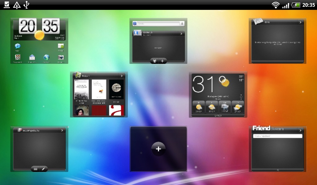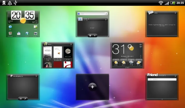 A telefonokhoz hasonlóan a tablet alapállapotában a kezdőképernyők valamelyike lesz előttünk nyitva. Ezekből összesen nyolc darab áll rendelkezésre. Sorrendjük igen, számuk viszont nem módosítható. A többi Sense verzióhoz hasonlóan csiptetős zoomal az áttekintő Leap View nézetet hívhatjuk elő, ami viszont a Flyernél újdonság, az a képernyő közötti lapozás gusztusos, 3D-s effektje. Mivel táblagépről van szó, a képernyők nemcsak álló, de fekvő helyzetben is működnek, ilyenkor természetesen a dizájnjuk és a widgetek dizájnja is megváltozik (amelyiknél ez funkció), ráadásul az aktuális képernyőn túl a mellette lévő kettőről is kapunk egy kisebb képet.