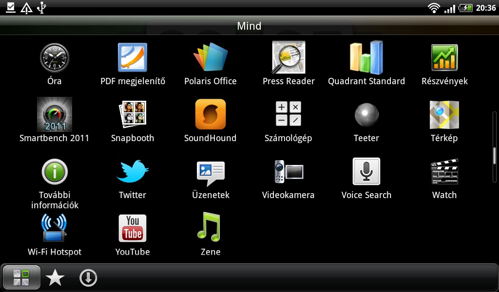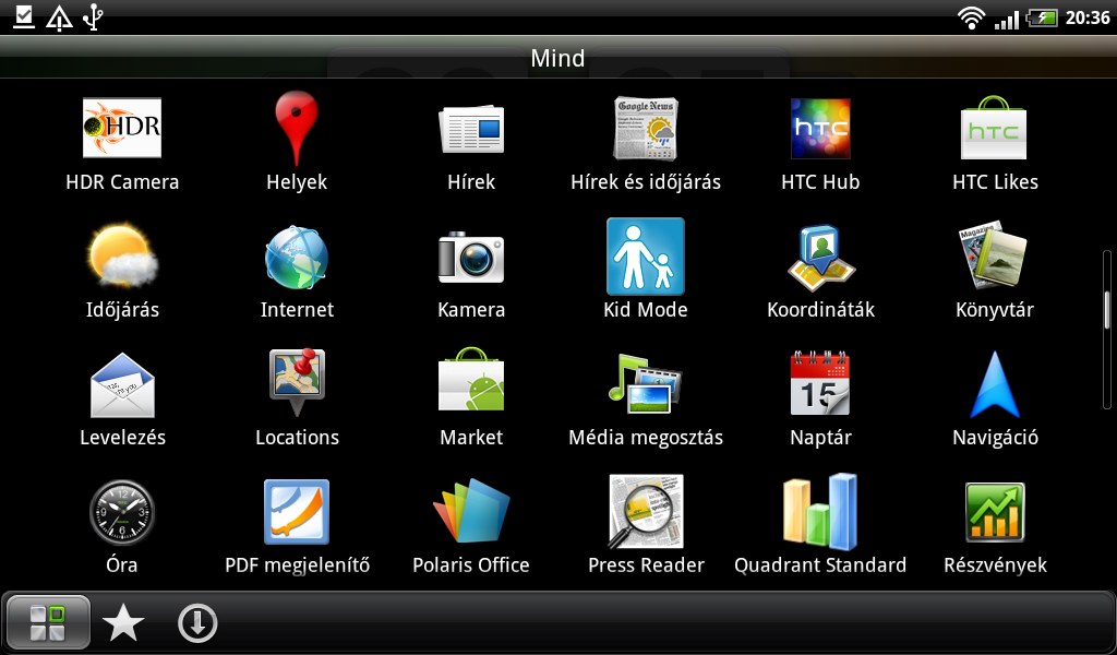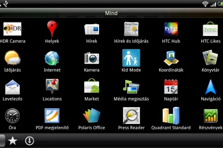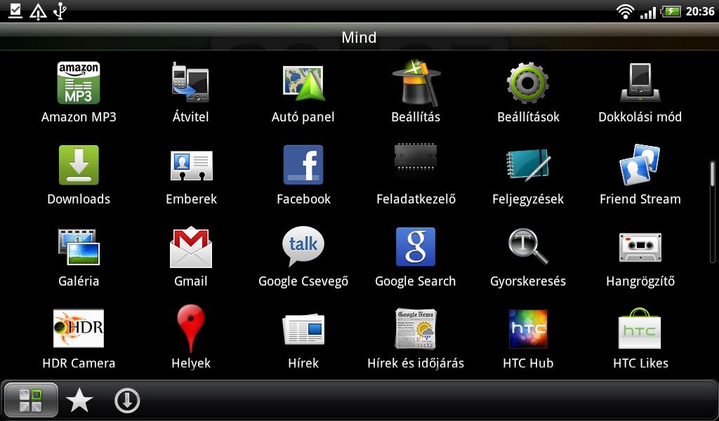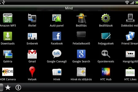 A főmenü az új HTC készülékeknél megszokott módon ABC- és telepítési sorrendbe is átkapcsolható, ezen kívül külön fülek alatt láthatjuk az összes, a kedvenc és az általunk telepített alkalmazásokat. Már csak egy dolog hiányzik: a szabadon módosítható sorrend.
