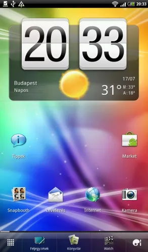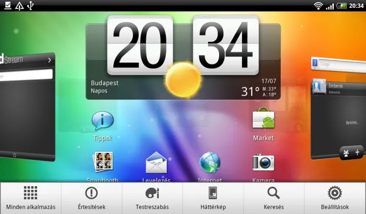 Sajnos továbbra sincs lehetőség az összeállítások automatikus cseréjére, tehát nem állíthatjuk be például, hogy reggel 8-tól este 8-ig a Work, egyéb időpontokban viszont a Play scene legyen aktív, mint ahogy nem választhatunk külön háttérképet a lezáró- és a főképernyőknek sem. Widgetek területén a HTC továbbra is nagyon jól áll, rengeteg érdekes és hasznos minialkalmazást kapunk, így például többféle órát, naptárat, időjárás-jelentést, és így tovább. Ezek jó részének ráadásul külön dizájnja van álló és fekvő helyzetre is.