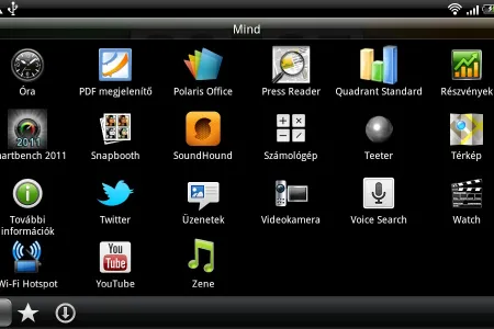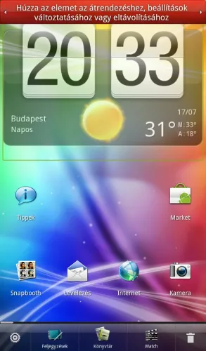 Legyen szó bármelyik kezdőképernyőről, ezeken alul egy sorban öt ikont láthatunk, ezek közül az első a főmenüt indítja el, az utolsó pedig a testreszabás menüt. A másik három szabadon beállítható, ide tehát kitehetjük a leggyakrabban használt programokat. Egy másik újdonság akkor kerül elő, ha egy widgetet hosszú ideig „lenyomva” tartunk: ilyenkor az alsó ikonsor két szélén lévő gombok közül a bal oldali fogaskerékre, a jobb oldali pedig szemetesre változik. Az utóbbira húzva a widgetet értelemszerűen törölhetjük, a bal oldalival viszont a beállításait változtathatjuk meg.