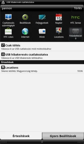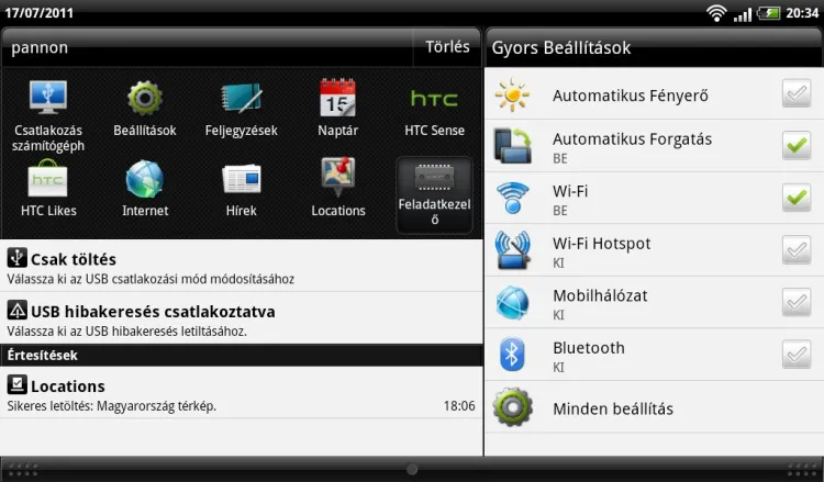 Az alap kezelőfelület részét képezi még a felülről lehúzható státuszképernyő, amit a HTC alaposan átdolgozott. Felső részén a legutóbb elindított 10 alkalmazás listáját láthatjuk, alul pedig két hasábban az Értesítéséket és a Gyorsbeállításokat találjuk.