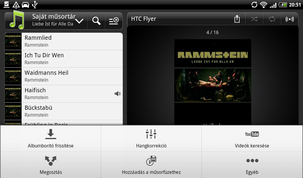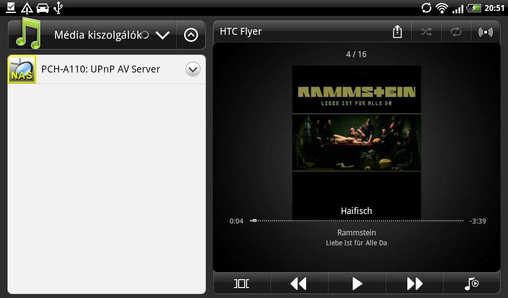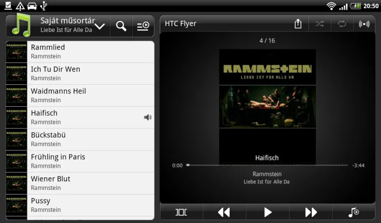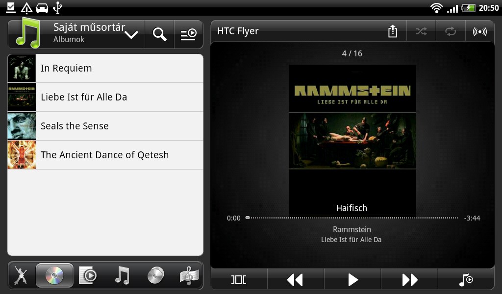 A tabletek igazi erőssége a médiafogyasztás, tehát a fotónézegetés, videólejátszás és zenehallgatás az, amiben a Flyernek igazán remekelnie kell. Ezek közül kezdjük a zenelejátszóval, ami állítva telefonra emlékeztető dizájnnal rendelkezik, fektetve viszont a korábbi programokhoz hasonlóan kéthasábos nézetre vált; balra egy böngészőt, jobbra pedig a lejátszót kapjuk.