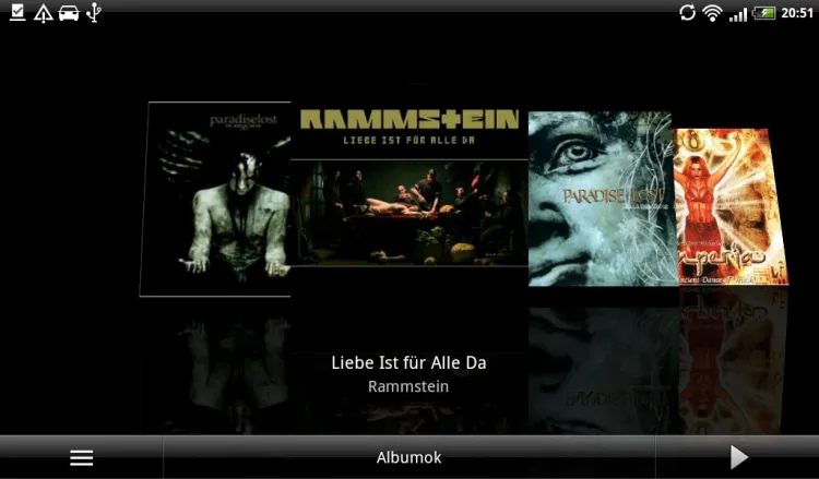 A másik hasábban fent négy gomb van, ezek közül a bal oldali a lejátszó kiválasztására szolgál (ismét a DLNA/UPnP segítségével), a jobb oldali pedig a hanghatások menüjét aktiválja. Az albumborító képe alatti gombok közül a bal szélsővel egy Cover Flowra emlékeztető nézetre válthatunk, ha ennek szükségét érezzük.