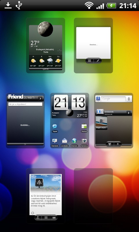 Extra netes funkció a Jelenet és Felszíngyűjtemény netes kiterjesztése –az újabb változatokat a HTC Hubról tölti le a telefon, ahol egyébként csengőhangok és háttérképek is megtalálhatóak. Sajnos továbbra sincs lehetőség az összeállítások automatikus cseréjére, tehát nem állíthatjuk be például, hogy reggel 8-tól este 8-ig a Work, egyéb időpontokban pedig mondjuk a Play scene legyen aktív, és nem választhatunk külön háttérképet a lezáró- és a főképernyőknek sem.