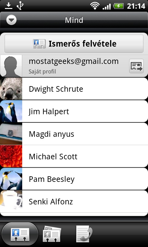 A telefonálás-üzenetkezelés párost tekintve a mobil az Androidtól megszokott barátságos képet mutatja. A névjegyek száma korlátlan és mindegyikhez számtalan információt vehetünk fel. Szokás szerint lehetőség van a Facebook, Twitter és más accountokkal való összekapcsolásra, így rögtön látjuk például a megosztott képeket, és azt is, ha mondjuk új telefonszámot töltöttek fel ismerőseink a Facebookra. A korábbi Desire-hez képest az egyetlen újítást az Ismerős felvétele gomb grafikája jelenti.