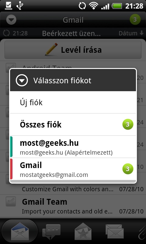 Levelezőkliensből kettőt kapunk: a Gmailhez tartozó a szokásos funkciókkal rendelkezik, míg a másikkal POP3, IMAP és Exchange fiókokhoz is kapcsolódhatunk. Az utóbbinál újdonság, hogy nemcsak külön-külön nézhetjük meg a fiókokat, hanem összefésülve is láthatjuk a beérkezett leveleket. Akinek több e-mail fiókja van, az nagyon hasznosnak fogja találni ezt a lehetőséget. A levelek letöltése teljesen testreszabható, a levelek szövegében pedig működik a copy/paste is.