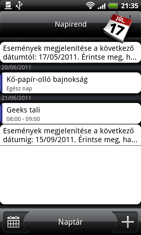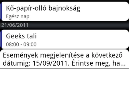 A teendők nyilvántartására a telefon remekül megfelel. A naptár rész nagyon jól sikerült, a menü segítségével villámgyorsan válthatunk a havi, heti és napi bontás között, illetve egy áttekintő, csak az események listáját mutató nézet is rendelkezésre áll, amihez a lenti, bal oldali gomb megnyomásával jutunk el. Apró figyelmesség, hogy az olyan eseményeknél, amelyek időpontjában az időjárás már ismert (azaz 5 napon belül van), a Desire S naptára ezt is kijelzi egy apró csíkban a képernyő alján.