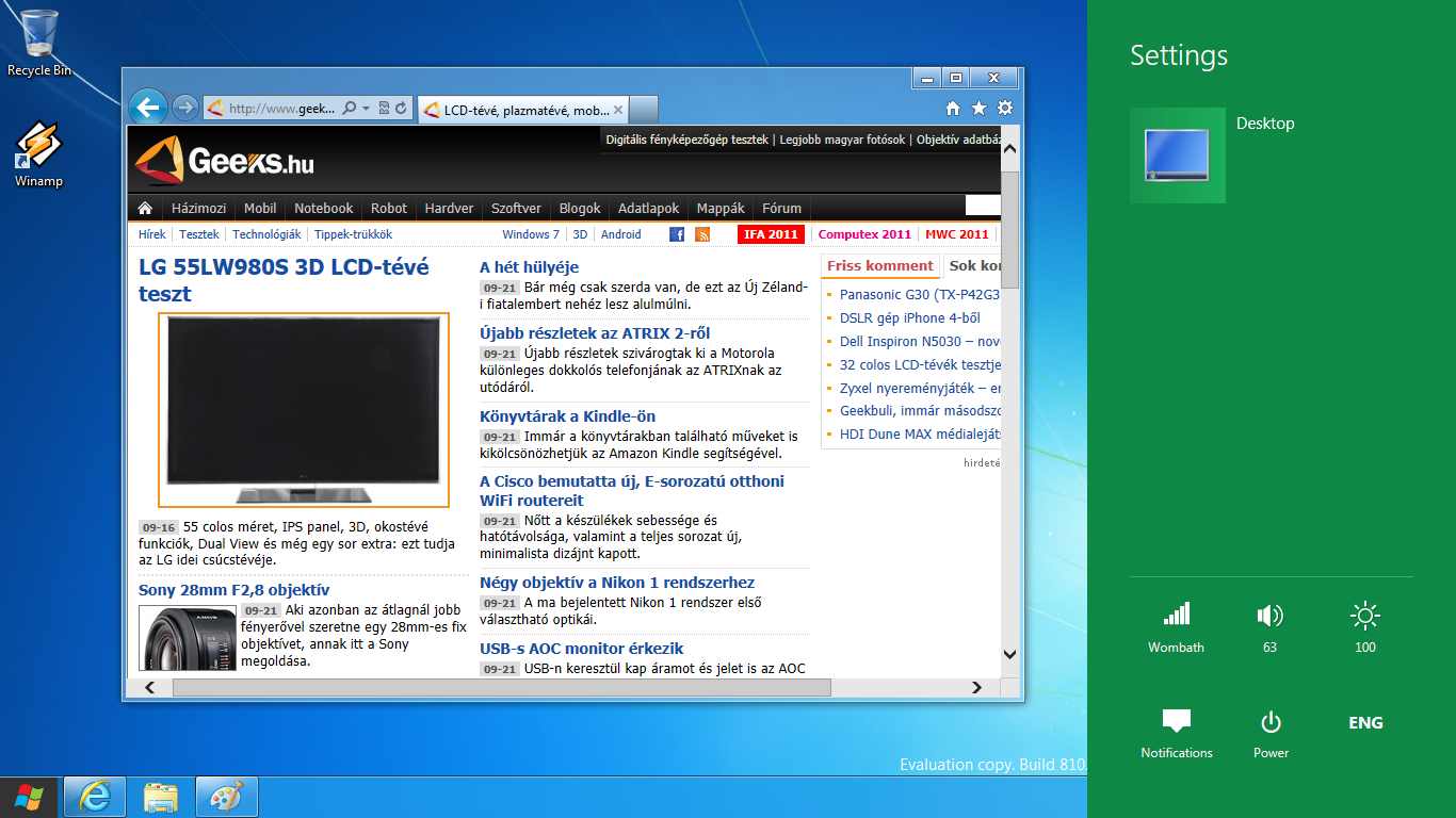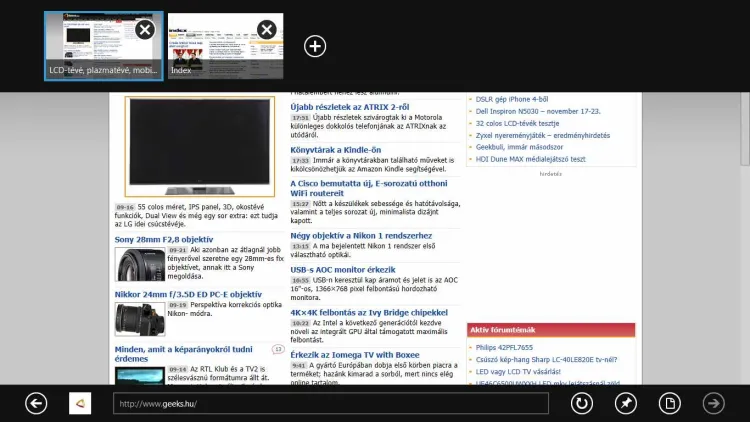 Ami a mellékelt programokat illeti, ezek természetesen azt hivatottak bemutatni, hogy milyen érdekes a Metro felület. Nagy kijelzőn egyik sem néz ki túl jól, hiszen inkább táblagépekre (7-11 col) optimalizálták őket. Van közöttük több egyszerű játék, RSS olvasó, a már említett időjárásjelző és részvényfigyelő is. Amit érdemes kipróbálni, az az Explorer, ez ugyanis mind Metro, mind hagyományos változatban elindítható – az utóbbihoz először a standard asztalra kell váltanunk. Érdemes kipróbálni a táblás verziót, ennél ugyanis alul van a menüsor, felül jelennek meg a többlapos böngészőhöz tartozó ikonok, és némi várakozás után mindkét sáv eltűnik a képernyőről, hogy a táblagépek kisebb kijelzőjét ne foglalják feleslegesen (ha újra elő akarjuk hívni őket, kattintsunk a jobb egérgombbal).