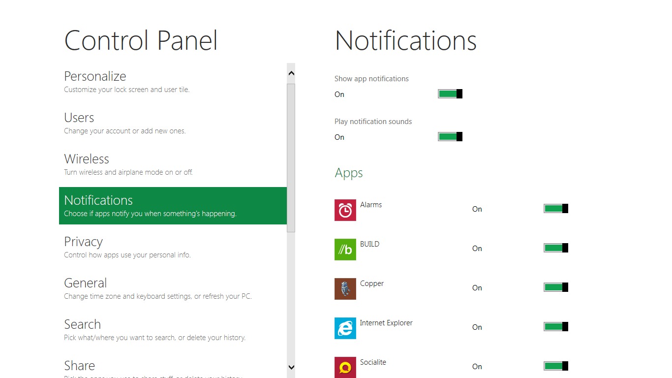 Visszatérve a Metro felületre, érdemes még itt megnézni a Control Panel csempét. Ha rákattintunk, az alapbeállításokhoz jutunk, amelyek szintén ujjal kezelhető, nagy csúszkákat kaptak. Az érdekességek között van például a Privacy, amivel megmondhatjuk, hogy az alkalmazások milyen személyes adatokhoz férhetnek hozzá.
