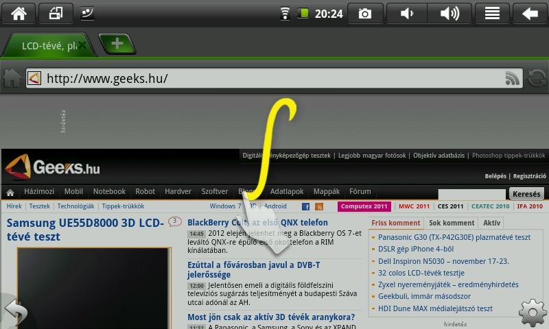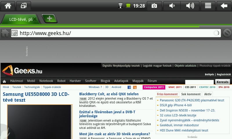 Az oldalak rendben betöltődnek, nincs igazából gond a megjelenítéssel. A browser nagyítás után szépen tördeli be a szöveget, hogy könnyebben olvasható legyen a képernyőn. A Flash tartalmakkal természetesen a gép nem bánik el, egyrészt az Android 2.1 miatt, másrészt a hardver is kevés lenne hozzá. Így viszont legalább nem terheli a böngésző még jobban a rendszert. A görgetés közel folytonos, csak minimális a szaggatás mértéke, ennek köszönhetően olvasásra is jó lehet a készülék.