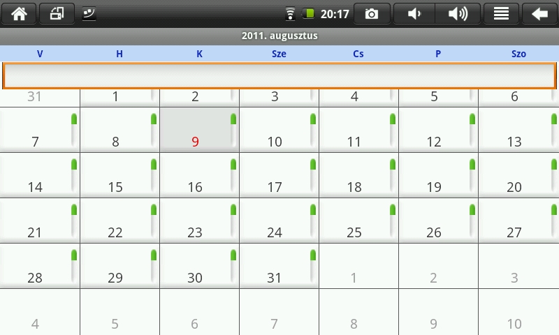 A naptár is a gyári megoldásnak néz ki, a készüléket magyar lokalizációra állítva még a napok is magyarosodnak. Két dolog van, amely nem stimmel. A hét első napja a vasárnap és sajnos nem lehet átállítani, hogy hétfővel kezdődjön a hetünk. A másik probléma a Google accounttal való együttműködés hiánya. A Google felhasználói fiókunk segítségével a telefonon beállított emlékeztető vagy esemény a tableten is jelezhetne számunkra, azonban ezt a lehetőséget itt nem tudjuk megadni.