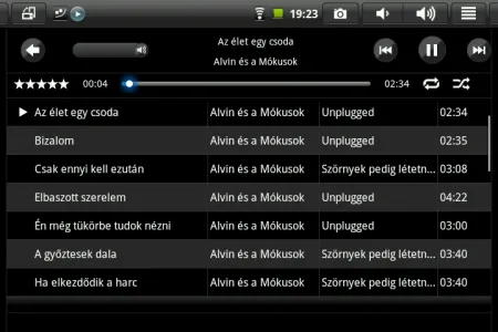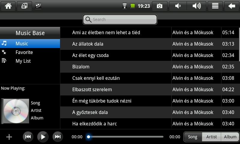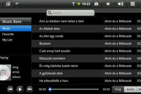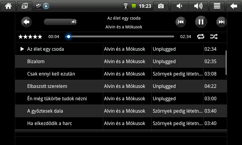 A zenelejátszáshoz a gyári lejátszón kívül kapunk egy másik alkalmazást is, ami frappánsan csak MusicPlayer névre hallhat. Ezt megnyitva két oszlopra bomlik a kijelzőt, bal oldalt a szám adataival és a lejátszási listával találkozhatunk, míg a nagyobb felületet elfoglaló jobb oldalon a zeneszámok listája található – cím, előadó és hosszúság feltűntetésével. Lent egy komplett vezérlősávot találunk, equalizer viszont sajnos nem jár a lejátszóhoz.