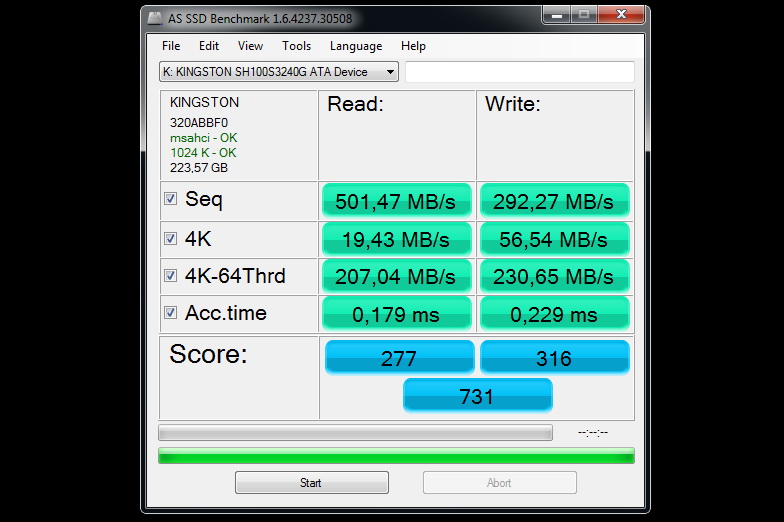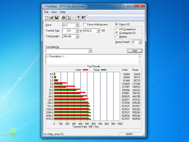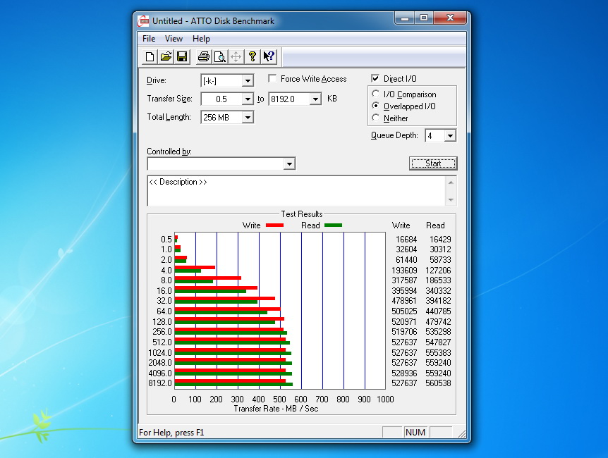 A meghajtó elméleti sebességének leméréséhez két tesztprogramot használtunk, az ATTO Disk Benchmarkot és a HD Tune Prót. Az ATTO Disk Benchmark szerint a Kingston 240 Gbájtos HyperX meghajtója olvasásnál 546 MB/s-ot ért el, míg írásnál 512 MB/s-ot (ez több mérés átlaga, természetesen).