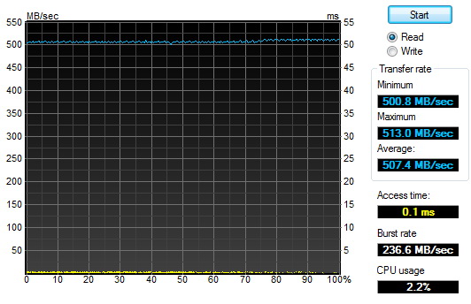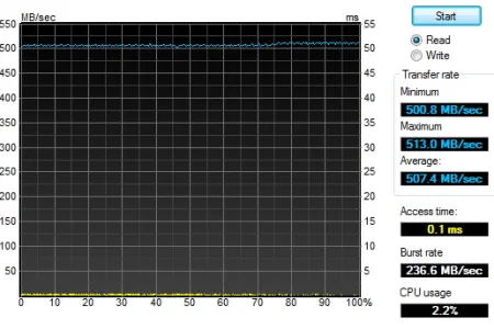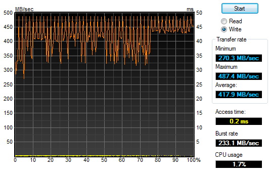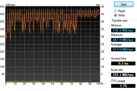 HD Tune Pro alatt már gyengébb eredményt kaptunk, az olvasási tempó 507 MB/s körül alakult, míg az írás átlagos sebessége 417 MB/s volt. Ezek persze még mindig nagyon jó eredménynek számítanak.