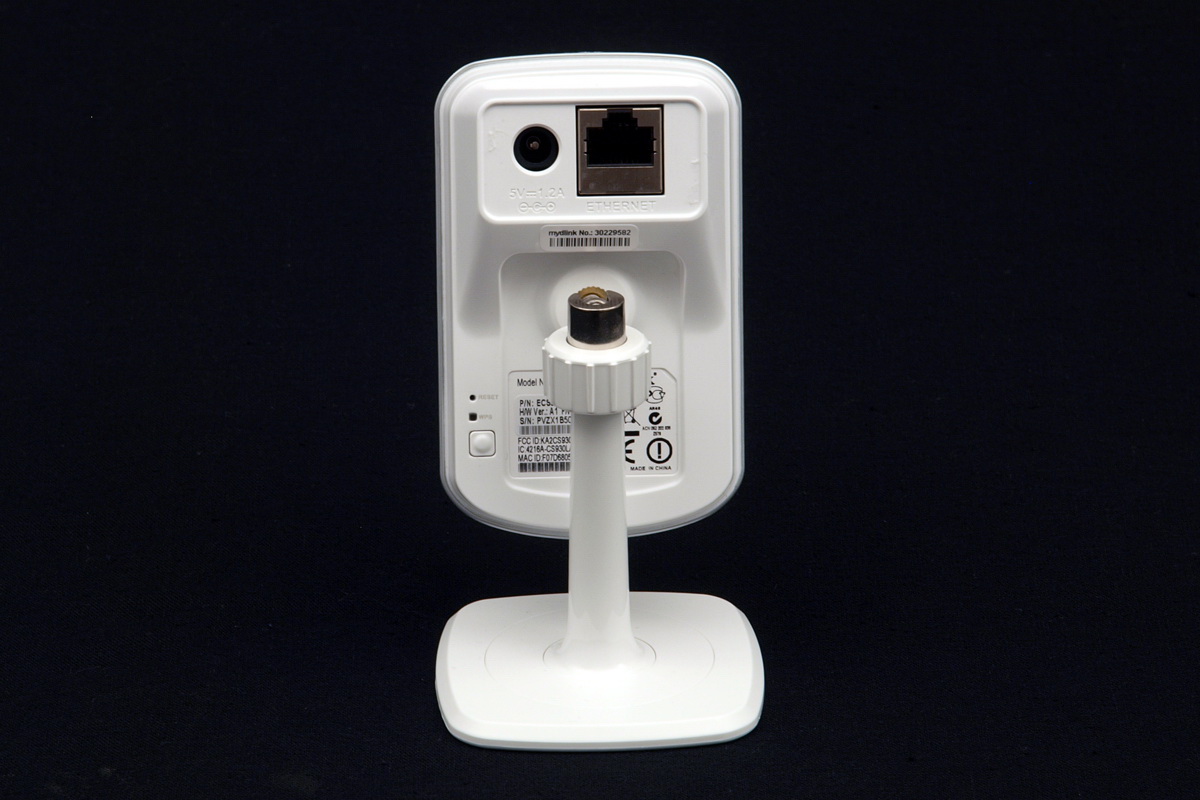 Hátra a tápcsatlakozó és az Ethernet csatlakozó kerültek, illetve itt találjuk a reset és WPS gombokat (utóbbihoz egy visszajelző LED is tartozik), valamint néhány matricát, amelyek a kamera fontos adatait, így például a MAC-címet és a mydlink azonosítót tartalmazzák.
