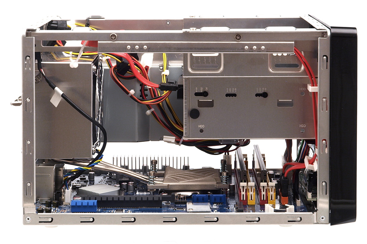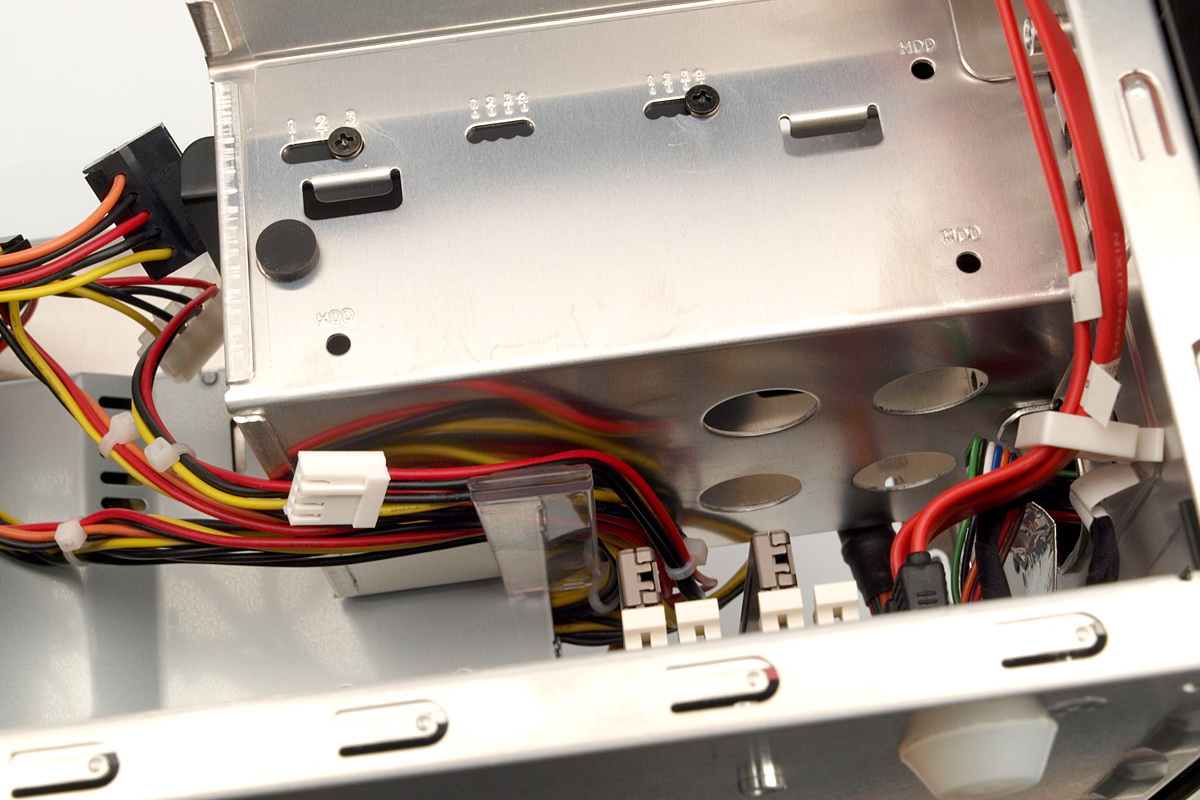 A kábeleket ebben az esetben is el lehet szépen vezetni (nagyrészt a HDD-keret alsó részén lévő vezető sínnek köszönhetően), de már nem egyszerű a művelet. A tápegységet nem kell kiszerelni, minden szükséges csavarhoz e nélkül is szépen hozzá lehet férni.