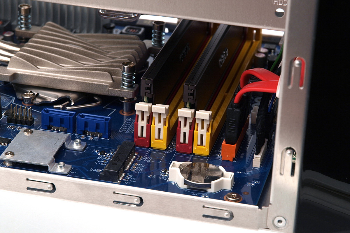 Az optikai meghajtó és a merevlemezek beépítése a szerelvény kiemelése után (két csavar tartja) gyerekjáték, az előlapi takarókat pedig egyszerűen ki tudjuk lökni, ha arra szükségünk lenne. A szükséges kábelek mérete pontos, éppen akkorák, hogy be tudjuk őket pattintani a helyükre. A PCIe foglalatba illeszthető kártyák hátoldali nyílását egy-egy csavart tartja a helyén, ez a megoldás sokkal igényesebb, mint sok olcsó barebone konfiguráción a hajlítós-kitörős verzió. A memóriafoglalatokhoz a borítás levétele után azonnal hozzáférhetünk, így a modulok bepattintása sem nehéz feladat. Az egyetlen dolog, amire vigyázni kell, az a hátoldalon lévő néhány extra nyílás, ezeket sajnos a hajlítós-kitörős módszerrel kell eltávolítanunk.