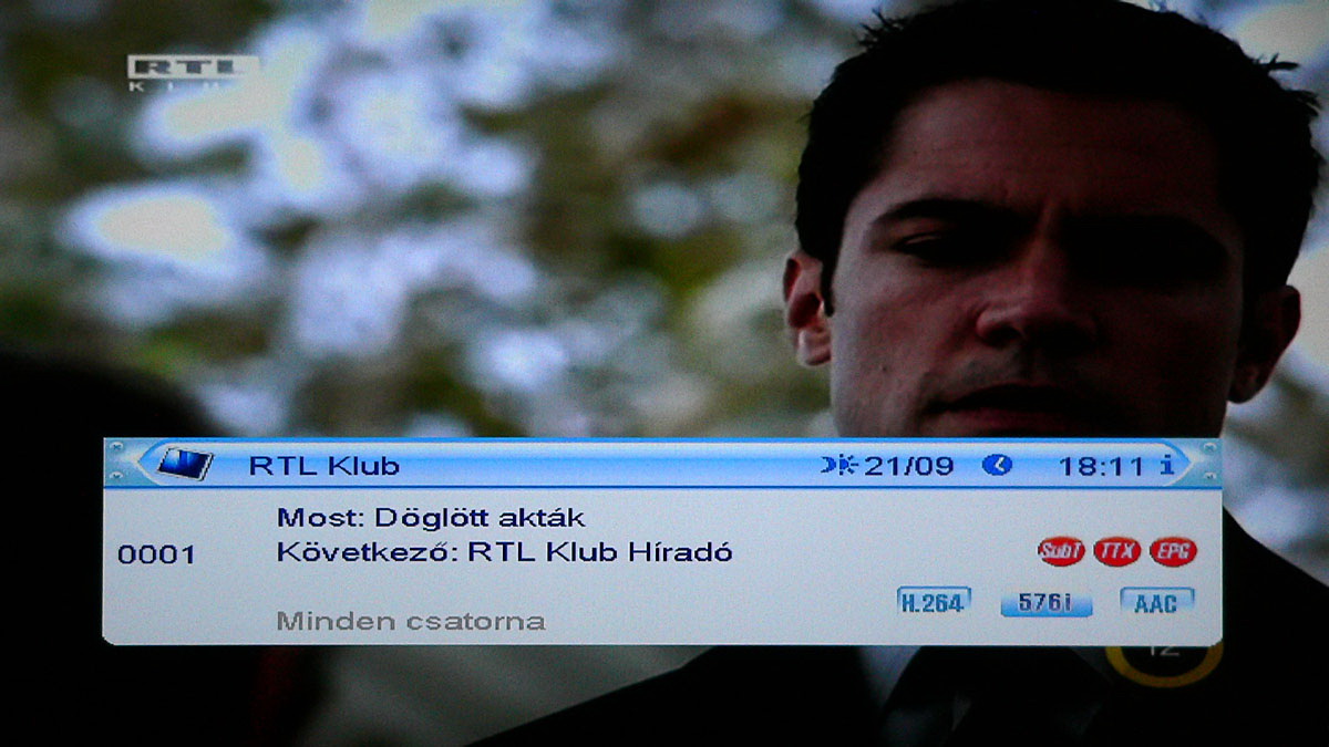 Csatornaváltásnál automatikusan felugrik az információs ablak, ami a csatorna fontosabb adatai mellett (név, felbontás, tömörítés, teletext és EPG) az aktuális és a következő műsor címét is tartalmazza. Időkukac nincs, vizuálisan így sajnos nem látjuk, hogy az aktuális játékidőből mennyi telt már el (óra természetesen van, tehát ez kiszámolható, de mégis kényelmesebb a grafikus szemléltetés). Ez a panel később természetesen az Info gomb megnyomásával bármikor elérhető. Sőt, ha az Info gombot még egyszer megnyomjuk, akkor az aktuális műsor részletes tartalma jelenik meg, ha még egyszer megnyomjuk, akkor pedig a szolgáltatás vételi adatai is láthatók.