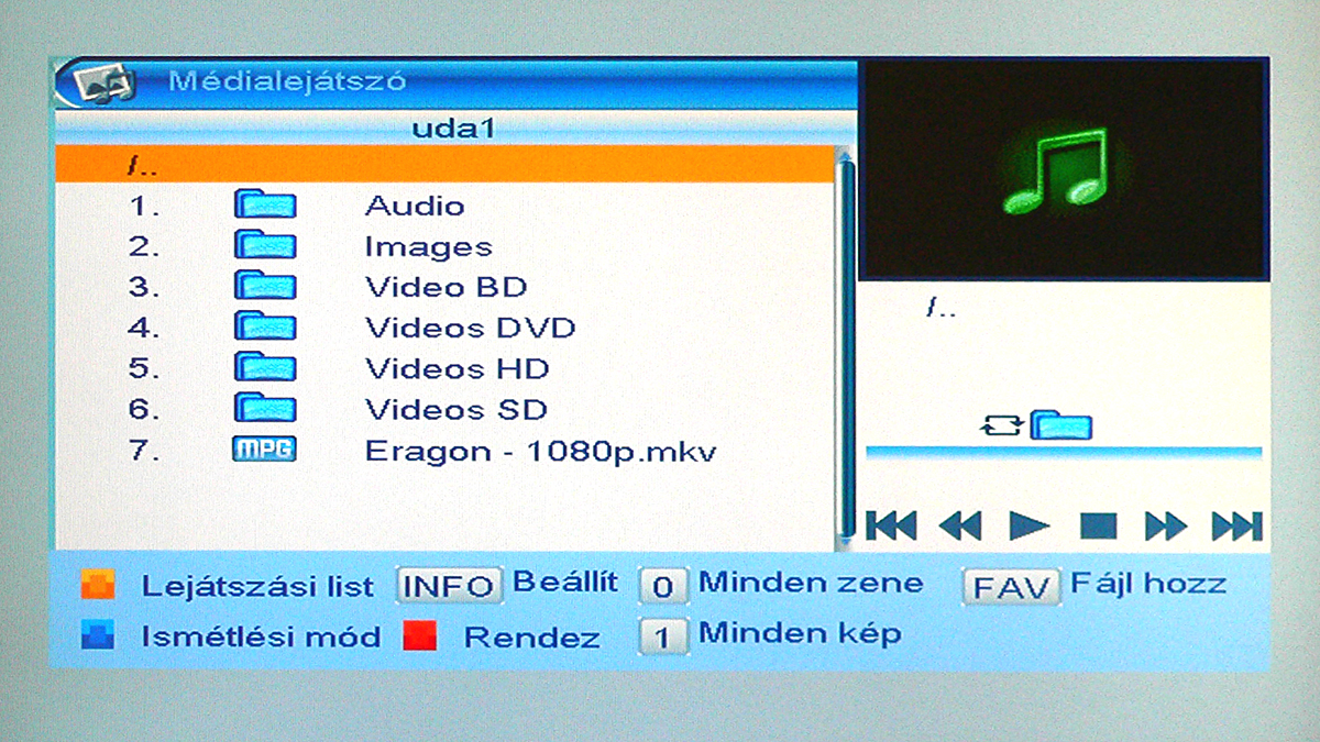 A médialejátszó kezelőfelülete a menü korábban megismert részeihez hasonlóan fapados, gyakorlatilag egy alap fájlkezelőt kapunk egy előnézeti ablakkal a jobb felső sarokban. A médiafájlok típustól függetlenül ömlesztve jelennek meg, szépen sorban. A médiafájlokhoz a távirányítók külön gombokat kapunk, így a filmek, zenék elindításához, a számok közötti ugráshoz mind-mind van külön gomb, ahogyan a feliratok illetve a hangsávok közötti váltásához is kapunk sajátot.
