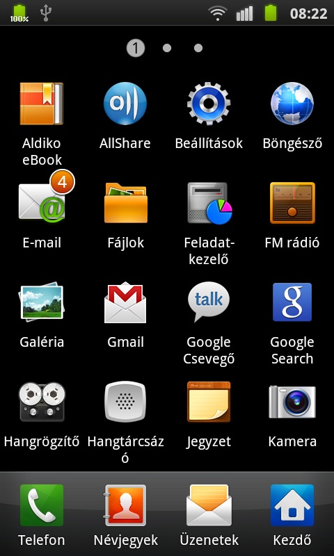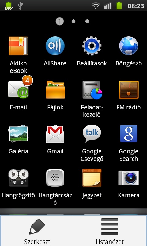 A lenti sorban található ikonokat szintén lecserélhetjük, mégpedig úgy, hogy a főmenüben megnyomjuk a menü gombot, majd a szerkesztést választjuk – ekkor a jobb szélső gombot leszámítva szabadon kitehetjük bármelyik program ikonját a gyorsmenüre. A főmenü testreszabhatósága nem rossz, lehet sorrendet módosítani, de hiányoznak a TouchWiz 4.0-ban látott mappák. Programokból nincs hiány: alapból közel három oldalnyi ikon fogad bennünket, a listát pedig természetesen nyugodtan tovább bővíthetjük az Android Marketről.