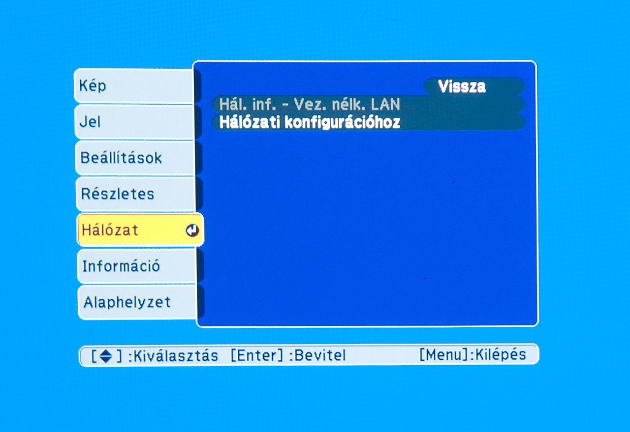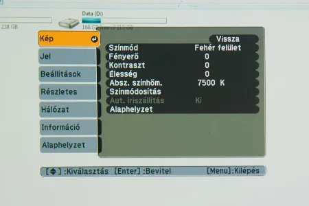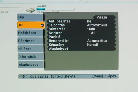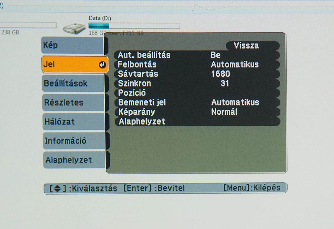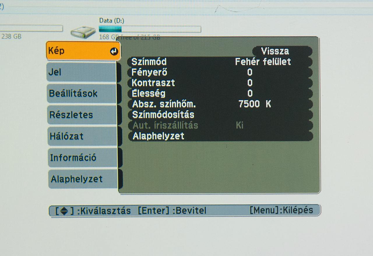 Egy jó prezentációs projektort nem kell hosszan állítgatni – ha ezt nézzük, akkor az Epson készüléke máris nyert, hiszen hamarabb elkészülünk beüzemelésével, mint hogy noteszgépünk betöltené a Windowst. Nem kell más tennünk, mint lerakni az asztalra, nagyjából beállítani, hogy a vászon felé nézzen, csatlakoztatni hozzá a számítógépet, majd bekapcsolni – a többit pedig elvégzi a beépített Screen Fit elektronika. Jelen esetben a többi az alábbi funkciókat takarja: automatikus élességállítás és automatikus trapézkorrekció függőlegesen és vízszintesen, valamint a képméret beállítása a vászon méretéhez.